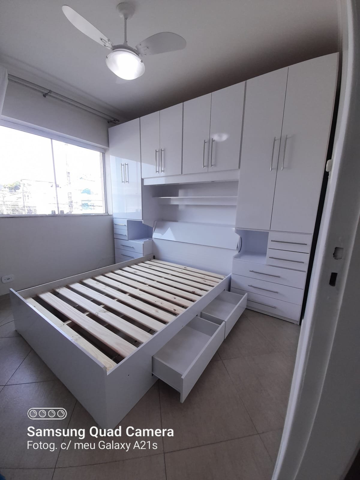 Dormitório de casal com cama embutida, versão mais simples, mas que de simples não tem nada: são 2 guarda-roupas com 10 gavetas no total, um maleiro de 4 portas bem espaçoso e com espaço interno para aproveitar seu cômoda da melhor forma.