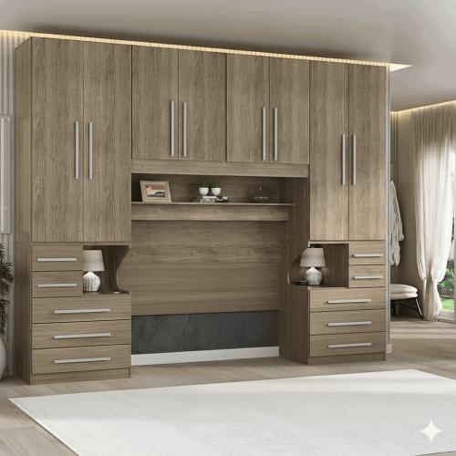 Itens inclusos | 02 Guarda-roupas de 2 portas e 5 gavetas com mesa de cabeceira embutida modelo 1224,01 Maleiro queen size 4 portas modelo 1226 e kit de ferragens. |
