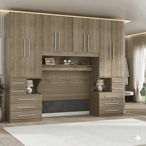 | Itens inclusos | 02 Guarda-roupas de 2 portas e 5 gavetas com mesa de cabeceira embutida modelo 1224,01 Maleiro de casal 4 portas modelo 1226, 01 kit de luzes de Led e kit de ferragens. |