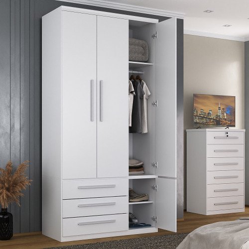 Guarda-roupa de 3 portas com um grande espaço interno para cabides e roupa de cama. Possui 1 porta menor que funciona como sapateira e 3 gavetas grandes. Conta com corrediças, dobradiças e cabideiro metálicos.