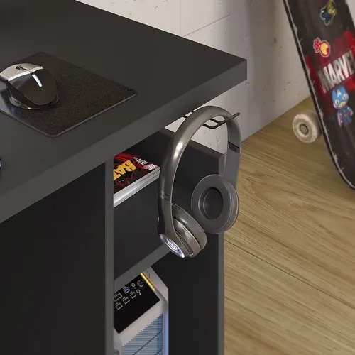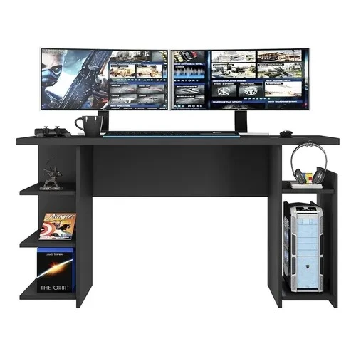 Desenvolvida para atender às necessidades do público Gamer a Mesa Gamer vai deixar a sua jogatina mais confortável e otimizada. Conta com Tampo de 25mm fornecendo grande estabilidade para você não errar nenhum HS, possuí nicho para acomodar o seu gabineteda melhor forma, 3 prateleiras para acoplar suas decorações, espaço para até dois monitores, facilitando assistir uma boa live enquanto joga, além de possuir também suporte metálico para o seu headset facilitando a organização desse item essencial. A também conta com passa-fios, afinal chega de cabos desorganizados não é mesmo.