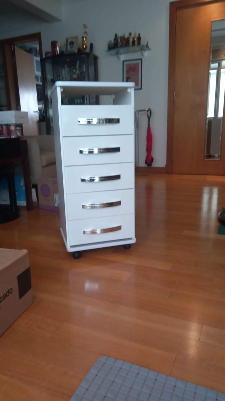 Balcão com 5 gavetas e com espaço acima da primeira gaveta para guardar pequenos objetos. Ideal para consultórios, escritórios e cozinhas.