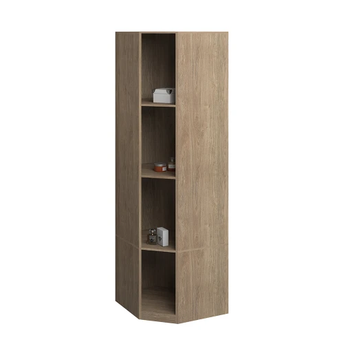 Armário de canto em formato sextavado, dividido em módulo superior e módulo inferior: conta com 3 prateleiras internas na parte superior e amplo espaço na parte inferior. É ideal para composição em “L”, ocupando 2 paredes – não exigindo grau reto.