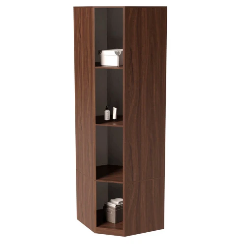 Armário de canto em formato sextavado, dividido em módulo superior e módulo inferior: conta com 3 prateleiras internas na parte superior e amplo espaço na parte inferior. É ideal para composição em “L”, ocupando 2 paredes – não exigindo grau reto.