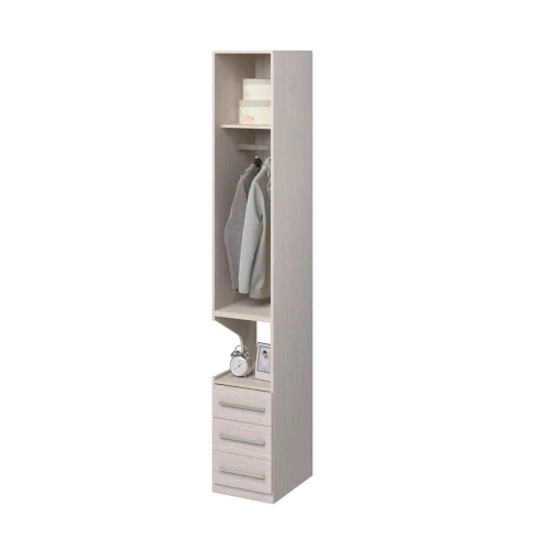 Guarda-Roupa de 1 porta e 3 gavetas mais espaço do mesa de cabeceira para objetos de cabeceira como rádio relógio, livros e etc. Dispõe de cabideiro, corrediças e dobradiças metálicas. Esta opção é para ser montada como na imagem, a Esquerda do maleiro. Para montagem do outro lado buscar a opção Direita. É possível também adicionar prateleiras e deixar o móvel com mais divisões internas.