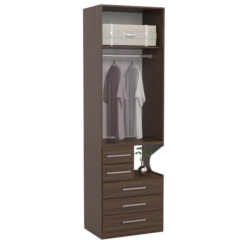 Guarda-roupa de 2 portas com bastante espaço interno para cabides. Conta também com 5 gavetas sendo 3 grandes e 2 menores e espaço que chamamos de mesa de cabeceira – comumente utilizado colocar objetos de cabeceira como rádio relógio, livros e etc.