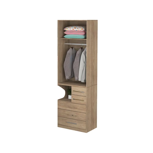 Guarda-roupa de 2 portas com bastante espaço interno para cabides. Conta também com 5 gavetas sendo 3 grandes e 2 menores e espaço que chamamos de mesa de cabeceira – comumente utilizado colocar objetos de cabeceira como rádio relógio, livros e etc.